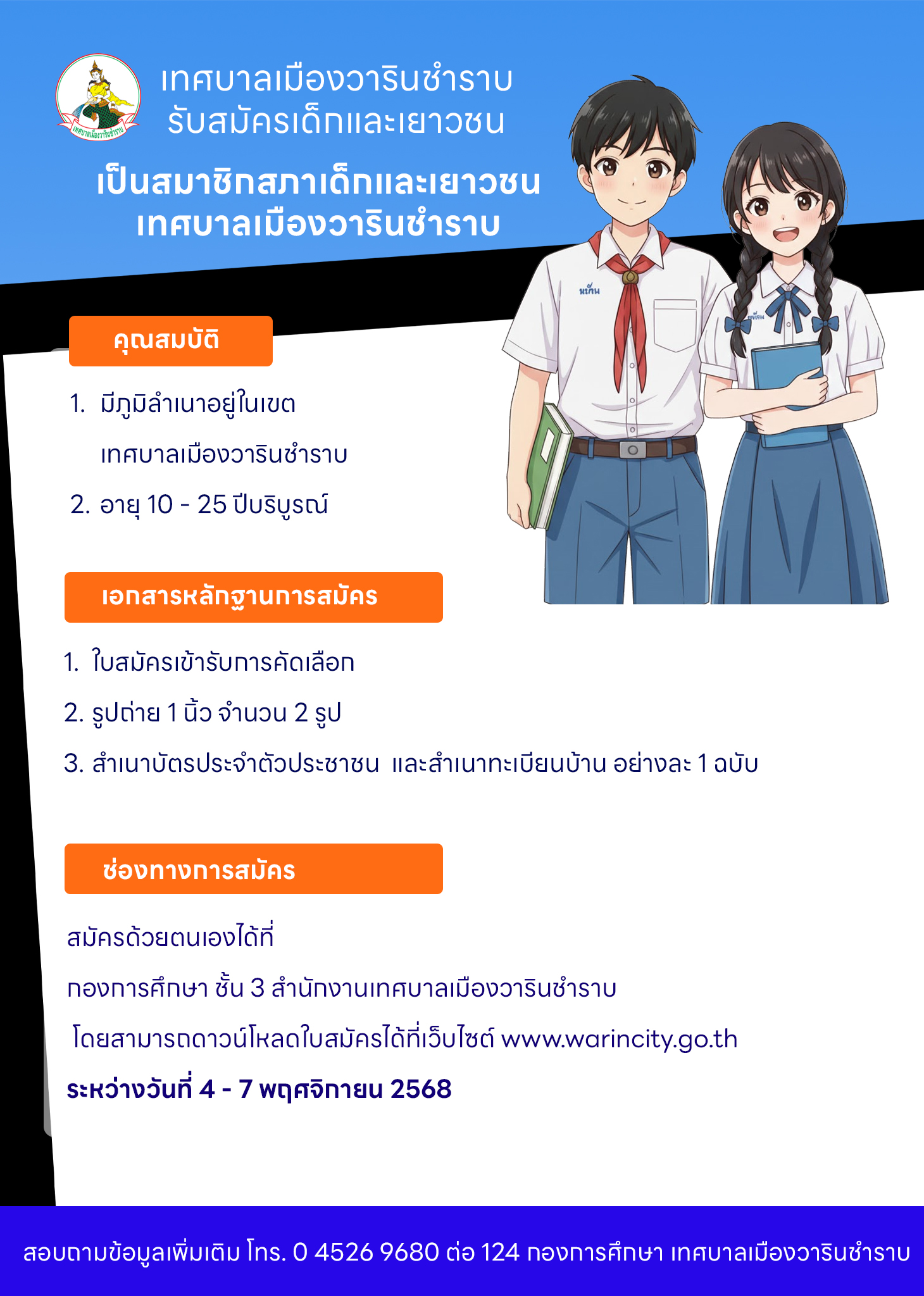 หน้าหลัก   ประชาสัมพันธ์ เทศบาลเมืองวารินชำราบ รับสมัครเด็กและเยาวชน เป็นสมาชิกสภาเด็กและเยาวชนเทศบาลเมืองวารินชำราบ