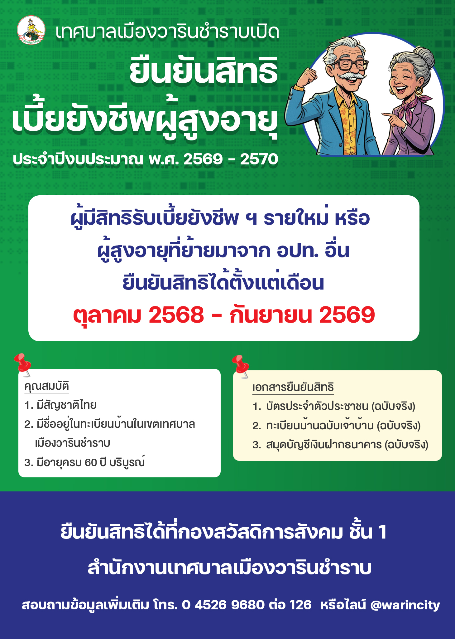 เทศบาลเมืองวารินชำราบ รับยืนยันสิทธิรับเงินเบี้ยยังชีพผู้สูงอายุ ประจำปีงบประมาณ พ.ศ. 2569 - 2570
