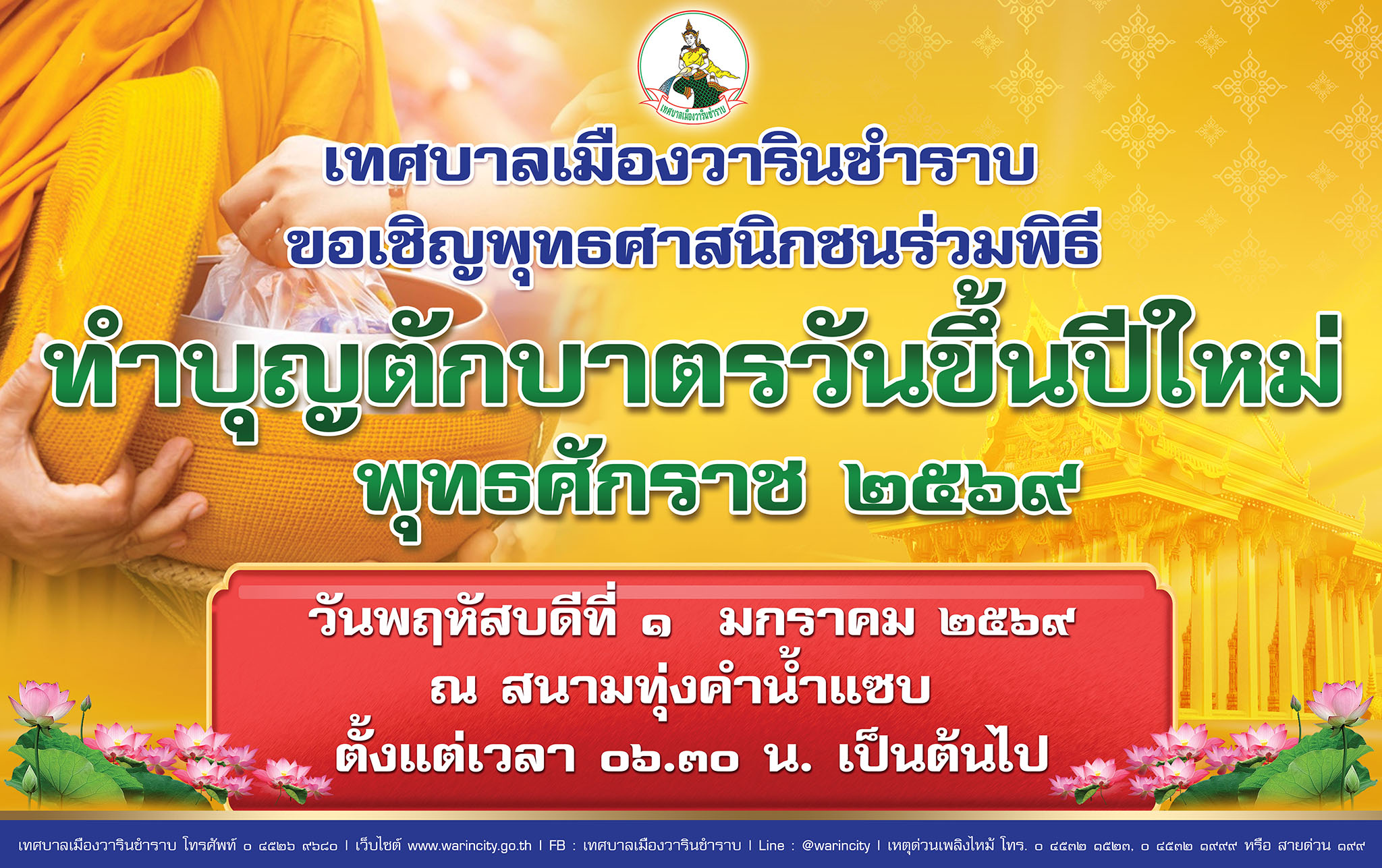 หน้าหลัก   ประชาสัมพันธ์ เทศบาลเมืองวารินชำราบ ขอเชิญพุทธศาสนิกชนร่วมทำบุญตักบาตรเนื่องในวันขึ้นปีใหม่ พ.ศ. 2569