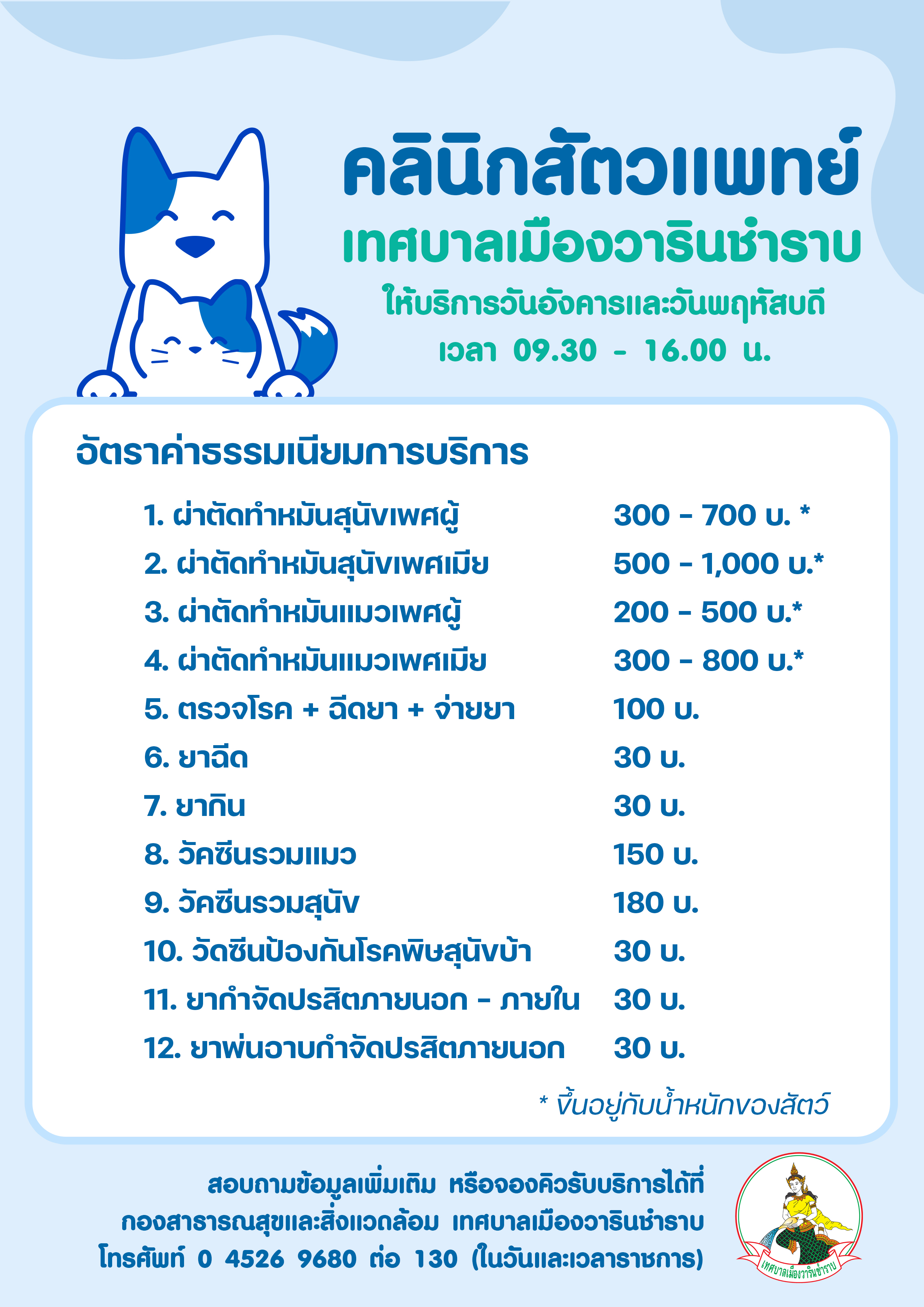 หน้าหลัก   ประชาสัมพันธ์ กำหนดเวลาทำการและกำหนดอัตราค่าธรรมเนียม สถานพยาบาลสัตว์ (คลินิกสัตวแพทย์) เทศบาลเมืองวารินชำราบ