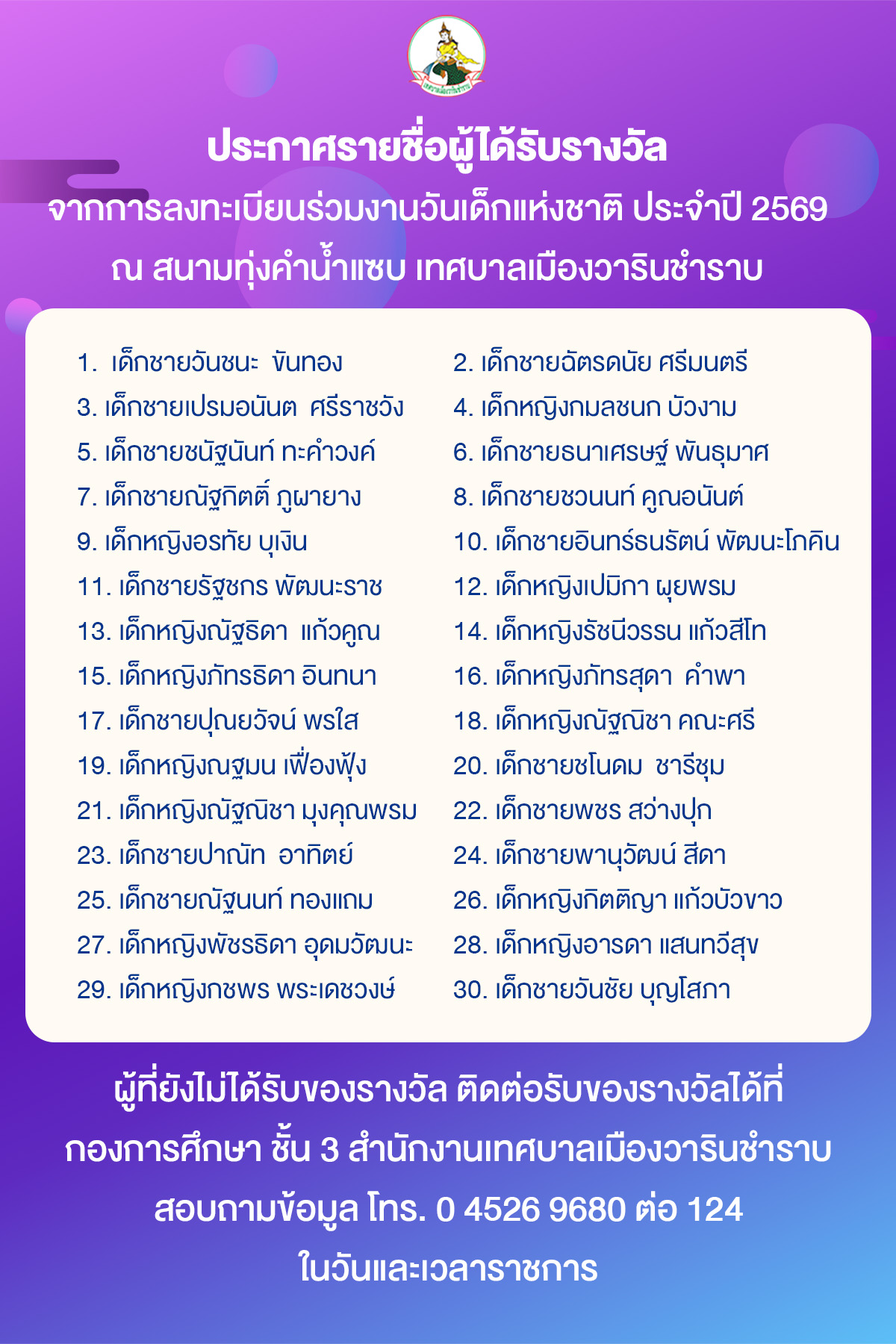 หน้าหลัก   ประชาสัมพันธ์ ประกาศรายชื่อผู้ได้รับรางวัลจากการลงทะเบียนร่วมงานวันเด็กแห่งชาติ ประจำปี 2569 ณ สนามทุ่งคำน้ำแซบ เทศบาลเมืองวารินชำราบ