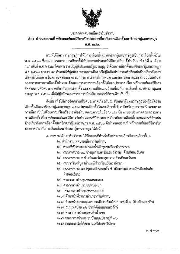 หน้าหลัก   ประชาสัมพันธ์ ประกาศเทศบาลเมืองวารินชำราบ เรื่อง กำหนดสถานที่ หลักเกณฑ์และวิธีการปิดประกาศเกี่ยวกับการเลือกตั้งสมาชิกสภาผู้แทนราษฎร พ.ศ.2568