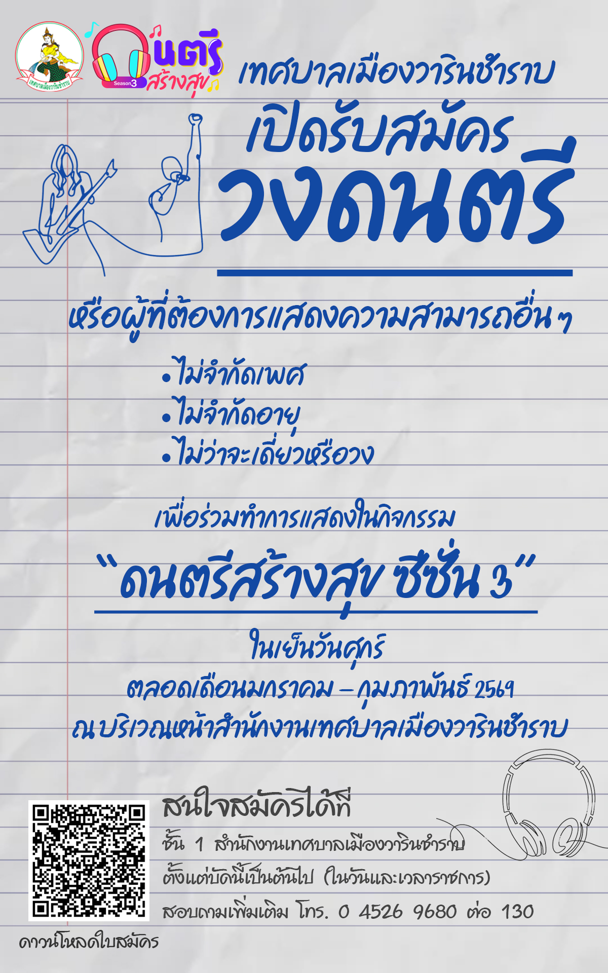 หน้าหลัก   ประชาสัมพันธ์ เทศบาลเมืองวารินชำราบ เปิดรับสมัครวงดนตรี หรือผู้ที่ต้องการแสดงความสามารถอื่นๆ ในกิจกรรมดนตรีสร้างสุขSS3